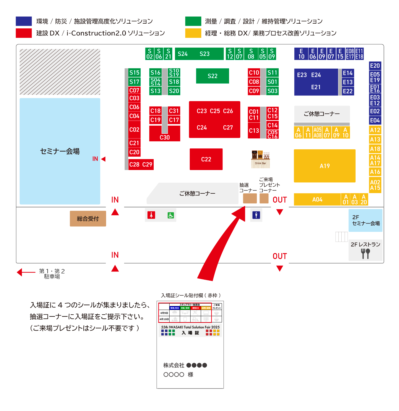 下記会場MAPの 青・緑・赤・黄 の4つのソリューションエリアを回って、各ブースで商品説明を受けるとシールをゲットすることができます!
