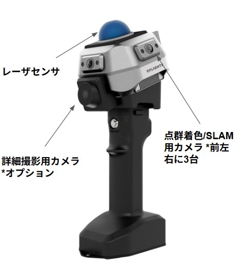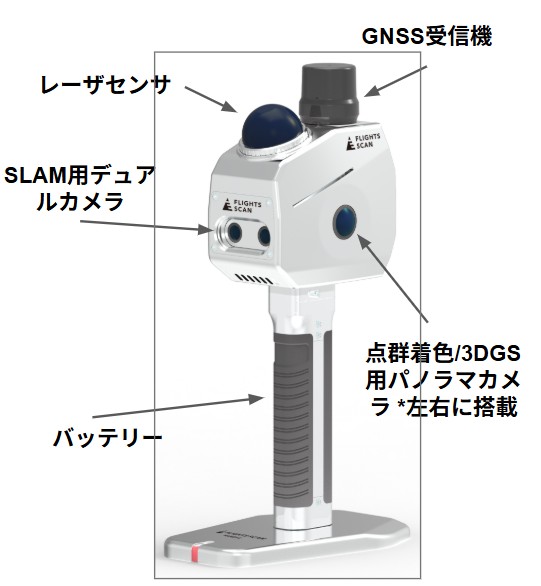 「FLIGHTS SCAN HANDY」は、小規模案件の3次元モデル作成や、ドローン測量等でデータ取得が困難な箇所の補測に最適な、エントリー向けのハンドヘルド型レーザースキャナーです。
