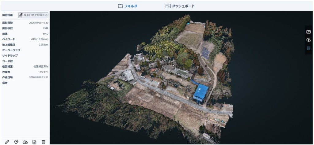 最大の特徴は、ドローンで撮影した写真データをアップロードするだけで、高精度な点群データ作成から土量の自動計算、2時点間の比較による出来高算出までを直感的に行える点です。エンジンの最適化によって解析時間を従来比で約85%も短縮し、計測当日からデータの活用が可能になります。
